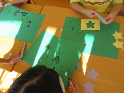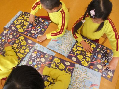 今日は月刊絵本を読みました。今月の絵本は、間違い探しや迷路といった頭を使うページがとてもたくさんありましたが、子ども達は先生の言葉を聞いて、上手に進める事が出来ていました。また、難しくて1人じゃできない時も、周りのお友達に教えてもらって、楽しそうに出来ていました。シールのページでは、「自転車→車→飛行機」の順番で貼るところや、「上から〇番目、左から〇番目」の場所を考えて貼るところ等、難しそうでしたがみんな上手にできていました。