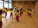今日は遊戯室で遊びました。まずは紙飛行機誰が1番飛ばせるか大会。遊戯室に移動する前に、お部屋で折り紙を使って各々好きな紙飛行機を作りました。それぞれかっこいい紙飛行機を作り、3人ずつ飛ばして1位〜3位を決め、さらに1位の人、2位の人、3位の人で、順位のグループごと投げて優勝を決めました。最近お部屋で流行っている紙飛行機を広い遊戯室で飛ばせてとても楽しそうでした。また、その後は時間が余ったので、じゃんけん列車をしました。楽しすぎて、1列になってもまた繰り返し何度も行いました。気づいたら給食の時間になっていましたが、怪我なく楽しい思い出が作れました。