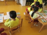 今日は、園庭で遊びました。赤組さんも出ていたので、一緒に遊ぶ姿が多く、とても楽しそうでした。芝生の山から落とし合いをしたり、追いかけっこをしたり、元気いっぱい体を動かして遊ぶ事が出来ました。また、室内で遊ぶ子もいました。最近は郵便ごっこで使うハガキを書くのが流行っており、お手本を見て上手に書いていました。