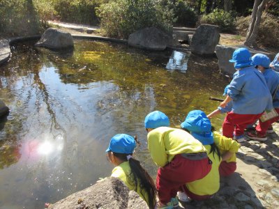今日は本郷公園まで散歩に出かけました。風が少なく、日があたる暖かい気候の中で遊ぶ事が出来ました。公園では、広いグラウンドで長縄や氷鬼をするチームと、奥の遊具があるところで探検隊やバーベキューをするチームに分かれて、各々好きな遊びで遊んでいました。長縄では、普段先生が回しているのですが、今日は「回してみたい!」という声があったので、回し手の挑戦もしました。先生の見様見真似でできる子や、先生と一緒に回してみる子がいました。探検隊では、自然の中に入っていって、ジブリのような世界観を楽しんでいました。帰り道に、ペットショップの前を通ると、お店の人たちが、ワンちゃんや猫ちゃんを見せてくれました。その後小学校の前を通って少し見学してから帰ってきました。いろんなことがあった1日でした。楽しかったね。
