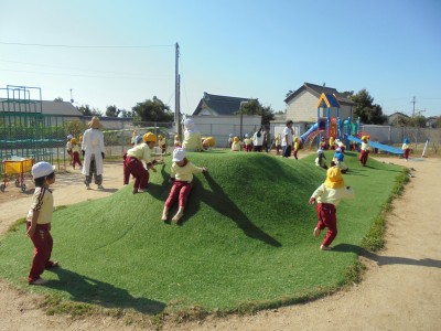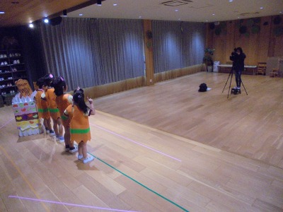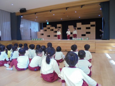 今日は、遊戯室でオペレッタを行った後に、白組さんの遊戯会の 練習を見ました。白組さんは、元気にお返事したり、手遊びをしたり してとっても可愛くて、黄組のみんなは、とても楽しく見ることが できました。