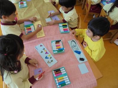 その後、散歩で持っていく為の小物入れを作りました。画用紙に マーカーで好きな絵を描いて、オリジナルの小物入れにしていきます。 ハートや車、虫など好きなものをたくさん描いていました。 みんな、自分の作った小物入れを持って、散歩に行くのを楽しみに しているみたいです。