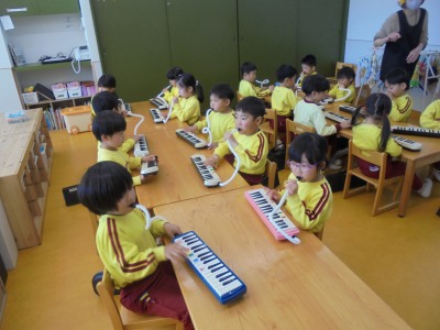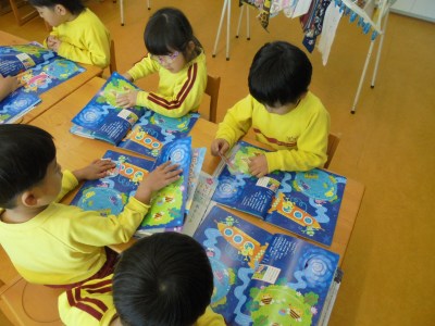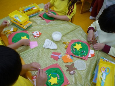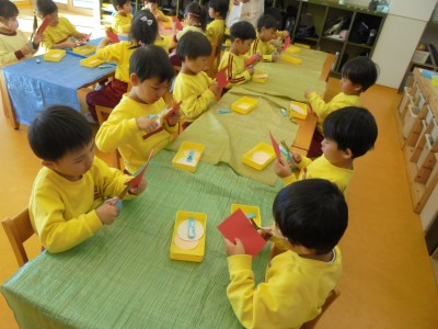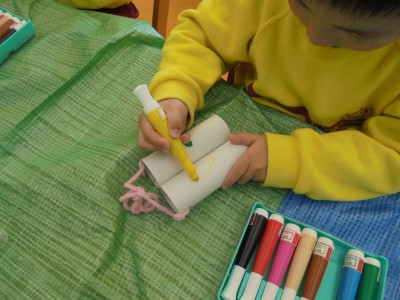今日は、2月に行うおみせやさんごっこの品物作りをしました。 今回は、双眼鏡を作りました。 トイレットペーパーの芯を2つくっつけて、毛糸をつけて形を作って おいたので、マーカーで模様や絵を描いて完成させていきました。 ハートや虹など好きなものを描いてカラフルに仕上げていきました。 お客さんが喜んでくれるように一生懸命作っていました。 その後、園庭で遊びました。今日は、とても風が強く肌寒い日でしたが、 みんな、元気に体を動かして遊んでいました。時々、風で砂が舞うこと もありました。園庭に水を撒きながら、砂ぼこりがなるべく舞わないように しながら戸外遊びを進めていきました。