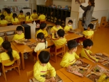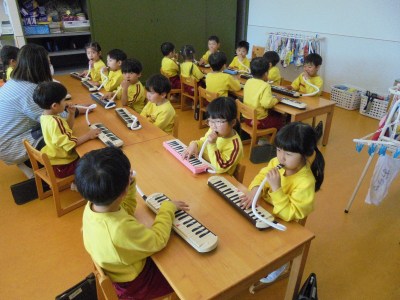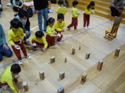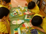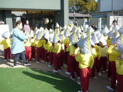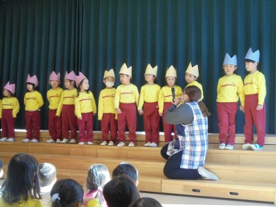 今日は、1月生まれの友達の誕生会が、遊戯室で行われました。 「今日は、誕生会だよ」と子ども達に伝えると、嬉しそうな笑顔を 見せていました。 誕生会が始まると、お誕生日の子どもは大きな声で名前や年齢を言い、 質問にも答えていました。恥ずかしそうにしている子どももいましたが、 しっかりと発表することができました。 その後、どこが変わったでしょうクイズをしました。出てきた先生が、 幕が閉まって開いた後に、どこかが変化しており、子ども達は、 どこが変化しているのか手を挙げて答えていました。 少し難しい所もあり、苦戦していましたが、当たると大喜びしていました。