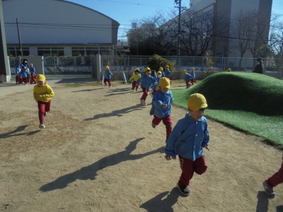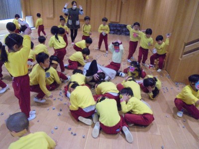 今日は、豆まきをしました。先週、新聞紙で豆を作ったり、鬼のお面を 作ったりして準備はオッケー。ずっと楽しみにしていました。 いざ、豆まきをする為、遊戯室に移動するとちょっぴり不安そうな子ども達 でした。青組鬼がやってくると、勢いよく豆を投げていました。青組鬼の 迫力に驚いて泣いてしまう子どもも数名いました。最後は「鬼は外」と みんなで声を揃えて豆を投げ、青組鬼を退治することができました。