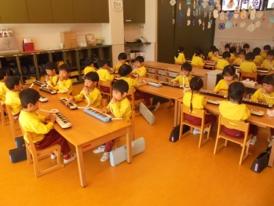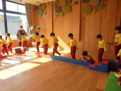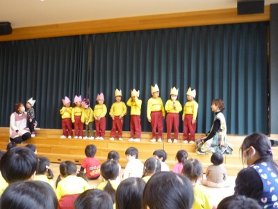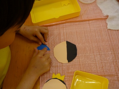 今日は、遊戯室で、集団遊びをした後、お部屋に戻り、ひな祭りの製作をしました。今、実習生と一緒に生活していますが、今日は、実習生が考えてくれた動物真似っこゲームをしました。チームに分かれ、真似をするチームの動物が何か、チームの友達と相談して決めて発表していました。犬や象、カニなど、自分なりに考えて、その動物になりきっていました。みんなで相談するという事も、上手になってきました。ひな祭りの製作は、お内裏様とお雛様を完成させ、菱餅も作りました。ピンク、白、緑を重ね合わせていくのが、難しかったですが、みんな丁寧に作っていました。