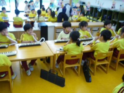 今日は、メロディオンを演奏しました。準備もスムーズにできるようになり、指番号やドレミファソの位置も分かるようになってきました。「とんとんとんとんひげじいさん」の曲をお別れ会で発表することを目標に、今日も張り切って練習しました。みんなで音を揃えることや、音を鳴らさない時も揃えること、先生の合図をよく聞きことも、意識しながら取り組めるようになってきています。「かえるのうた」も挑戦していますが、練習すればするほどいい音が聴こえてきます。お家でも励ましてあげてくださいね。メロディオンの後は、園庭で遊びました。今日は長縄も出して遊びました。いろんな遊びに挑戦していきたいです。