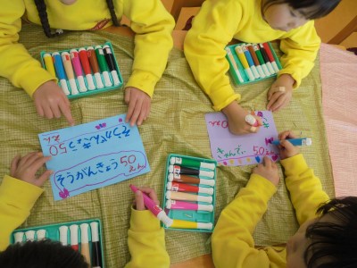 次は、鬼になり青組さんを驚かせにいきました。お面をかぶり、鬼に 青組の教室にいきました。先生や青組さんを捕まえたり、「オー」と 声を出して脅かしたりしていました。