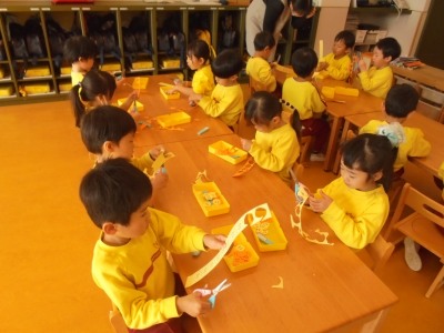 | ■遊戯室で遊んだ後、ひな祭りの製作をしました。 |