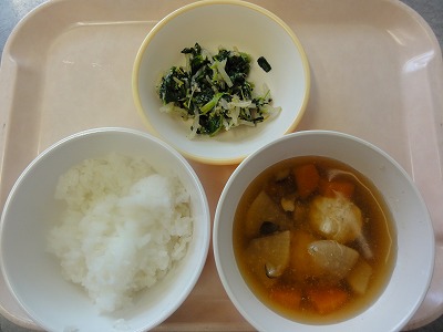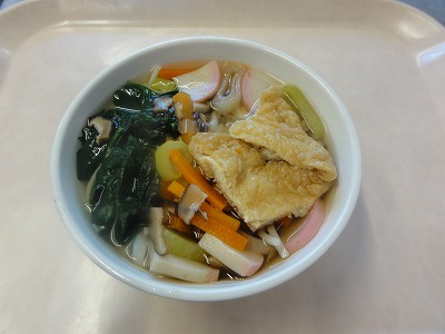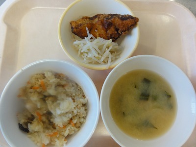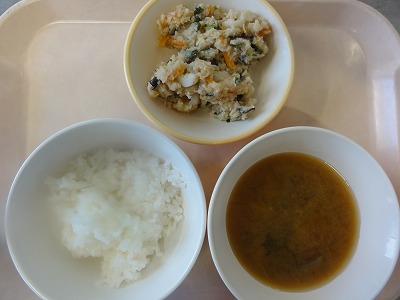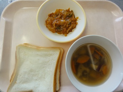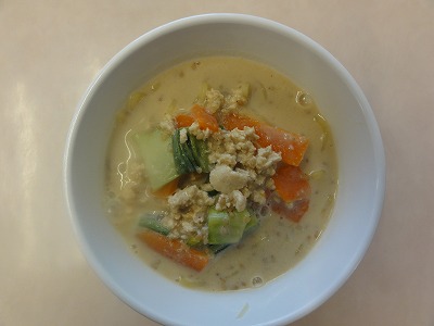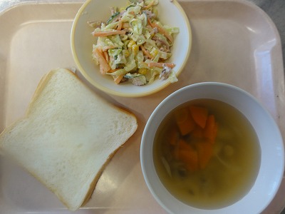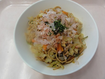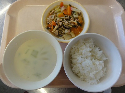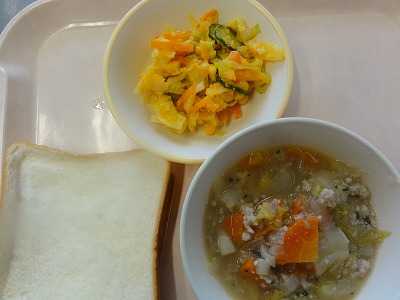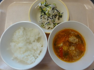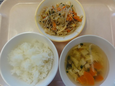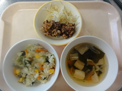 マーボー豆腐はにんにく、しょうが、葉ねぎの芯を香りよく炒め、玉ねぎ、人参を炒め、赤みそ、砂糖、しょうゆ、トマトケチャップ、中華スープで調味し、葉ねぎと、スチコンにかけて水切りした豆腐を加えて煮ました。水溶き片栗粉でとろみをつけ、ごま油をふって仕上げました。 ばんさんすうは春雨を茹でました。もやし、コーン、きゅうりをスチームにかけて冷やし、春雨、みかん缶と合わせて、しょうゆ、砂糖、酢、ごま油で調味しました。旨みいっぱいのマーボー豆腐と、あっさりしたばんさんすうの相性が良く、おいしく食べられました。