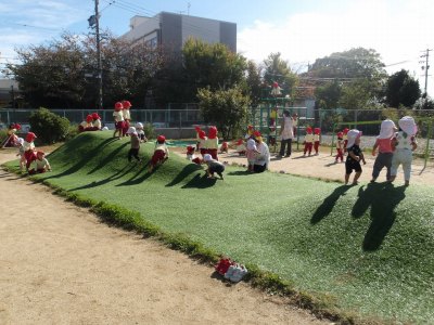 今日は園庭で遊びました。赤組さんも同じタイミングで外に出ていたので兄弟で遊んでいる姿もありました。人工芝の山とすべり台とそれぞれ半分ずつほどに分かれて遊び始めました。今回は場所を移動する子どもが少なく、同じ場所で遊んでいる姿が多かったです。明日はいよいよ遊戯会です。今日は遊戯室での練習はありませんでしたが帰る前に一度歌う予定です。