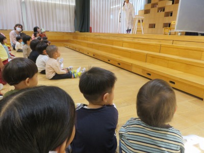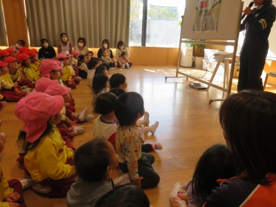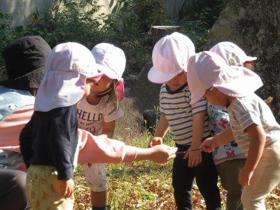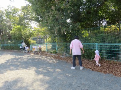 今日は、人数が少なかったので1歳児・0歳児一緒に高師本郷公園まで散歩に出掛けました。乳母車に乗っている子ども、先生と手を繋いで歩く子どもとそれぞれで向かいました。公園では大きなグラウンドの端に葉っぱがたくさんあったので落ち葉の上を歩いたり、先生と一緒に走ったりしました。帰りは、公園を回りながら落ちているドングリを拾って公園を出ました。ドングリや松ぼっくりをお土産として持ち帰る子どももいますので是非お家でもお話を聞いてあげてください。