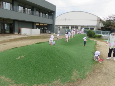 今日は園庭で遊びました。今回は芝生が人気で、自分で靴と靴下を脱ぎ、友達や先生と追いかけっこをしたり、お山を滑ったりして楽しんでいました。その他にも、どんぐりを拾ったり、赤組さんもいたので一緒に遊んだりする姿もありました。