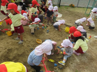 今日は、園庭で遊びました。すべり台、人工芝の山と好きな遊具、遊び場を選んで遊んでいました。途中から砂場をあけて玩具を出すと、砂場で遊びたい子どもが多く集まりました。赤組さんも一緒に遊んでいたので砂場は子ども達でいっぱいでした。