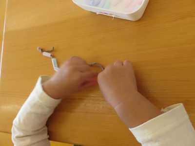 今日は、クリスマス会で使う帽子を作りました。糸に小さく切ったストローを通しました。少し難しく先生と一緒に行いましたが、みんな一生懸命頑張って通す姿が見られました。その後は、テラスに出て体を動かして遊びました。