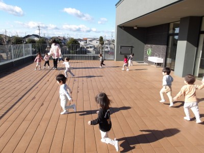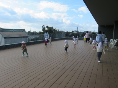 今日は、身体測定をした後、テラスで遊びました。身体測定は、何度も経験しているので慣れてきてスムーズに身長計や、体重計に乗って計測を待つことが出来るようになってきました。テラスでは、園庭で遊んでいた赤組さんや桃組さんを見たり、先生や友達と一緒に走って体を温めたりして過ごしました。