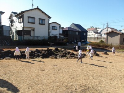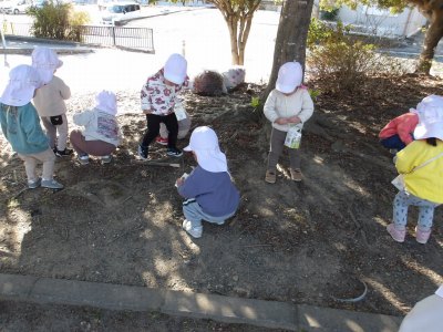 今日は小谷池公園まで散歩に出掛けました。公園では、水が入っていない池の中に入ったり、大きいどんぐりを拾ったり各々好きな遊び方で楽しんでいました。少し長い距離でしたがみんな最後まで歩く事ができました。