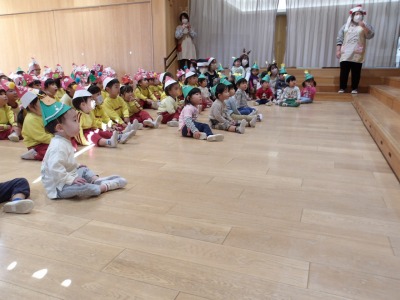 今日は遊戯室にてクリスマス会が行われました。先生がハンドベルを演奏してくれたり、お兄さんお姉さんがサンタさんに質問しているのを見たり、みんなで「赤鼻のトナカイ」を歌いました。その後はお部屋に戻り、しばらくするとサンタさんがお部屋に来てくれて、プレゼントを渡してくれました。みんなとても嬉しそうにプレゼントを受け取っていました。