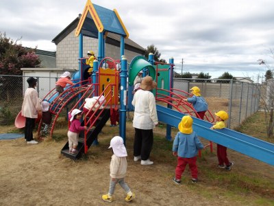 今日は園庭で遊びました。昨日雨が降っていたので、地面がまだ乾いていないところがあったり、芝生がまだ濡れていて遊べなかったりなど制限がありましたが、寒さに負けず元気いっぱい遊んでいました。黄組のお兄さんお姉さんもいたので、お世話をしてもらってとても嬉しそうな姿もありました。
