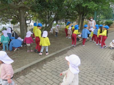 今日は、青組さんと一緒に本郷公園まで散歩に出かけました。お兄さんお姉さんに手を繋いでもらい、一生懸命歩くことが出来ました。公園では走って遊ぶ子どもや、前回同様にドングリを拾う子どもの姿がありました。帰りは疲れもあったのでゆっくりと歩いて帰ってきました。