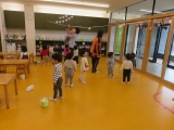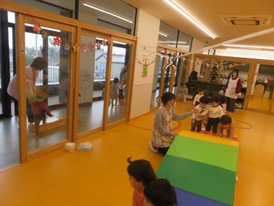 今日は、保育室でサーキット遊びをしました。布団とマットで作ったお山、一本橋、フラフープを順番にまわっていきました。お山は高いところもありましたが、上手に体を使って登っていました。フラフープはジャンプをして進んでいきました。どの運動も何度も繰り返すことで慣れていく姿がありました。サーキット遊びをした後は、少しだけ新聞紙遊びをしました。