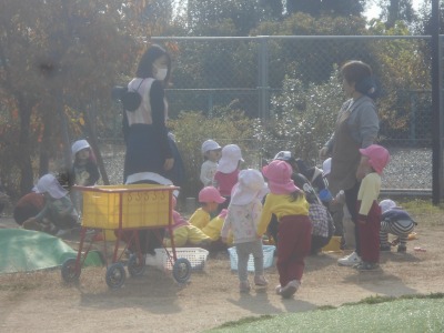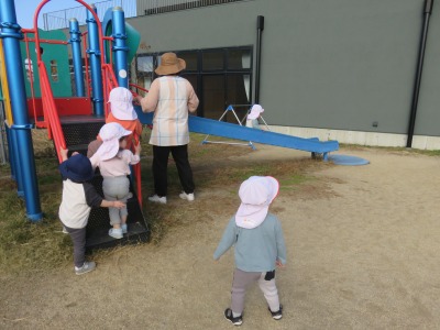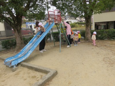 今日は、山腰第二公園まで散歩に出掛けました。今回は、乳母車は使わず、全員が歩きました。行きは坂道なのでスムーズに行けましたが、帰りは上り坂で疲れもあり、足が重くなる子どもが多くいましたが最後まで頑張って歩くことが出来ました。公園では滑り台で遊ぶ子どもが多くいました。少しずつ寒くなってきますが、寒さに負けず今後も散歩に出かけて元気に遊びたいと思います。