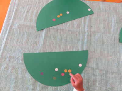 今日は、造形遊びをしました。まずは、クリスマス会でかぶる帽子に、シールを貼りました。その後は、今月の製作の続きをしました。前回は足形を取り、今回は、小さなホイール折り紙をちぎって、足形の周りにのりを使って貼りました。そして目のシールを貼りました。足形と目を使って出来上がったのは来年の干支である馬です。あとは先生が仕上げをして完成します。完成したら保育室に飾る予定なのでお楽しみにしていてください。
