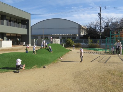 今日は、園庭で遊びました。いつもはすべり台で遊び始める子どもが多いですが、今回は芝生の山で遊び始める子どももいました。途中からは赤組さんも園庭で遊び始めたので一緒に砂場を出して遊びました。兄弟が何組かいるので兄弟同士で遊んでいる姿も見られました。