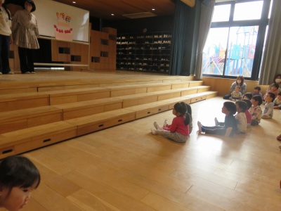 今日は、12月の誕生会でした。白組には12月生まれのお友達はいなかったのでお兄さんやお姉さんの名前や年齢の紹介を見たり、先生の出し物を見たりしました。ほとんどの時間を座って見ることが出来ていました。お兄さんお姉さんの自己紹介ではみんなと一緒に拍手をしてお祝いすることも出来ました。