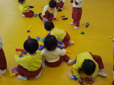 今日は園庭に出て遊びました。久しぶりの園庭でみんな元気に遊んでいました。その後はお部屋に戻っておみせやさんごっこで売るスマホを作ったり、ブロックで遊んだりしました。