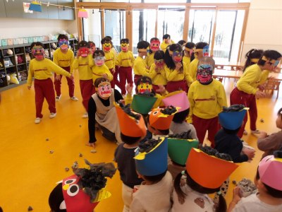 今日は豆まきがありました。鬼に扮した青組さんが来ると、迫力がすごく泣いてしまう子もいましたが、昨日豆を撒く練習をしていたので、一生懸命鬼に向かって投げていました。その後は節分に関する絵本を見て、少し時間があったのでテラスで遊びました。