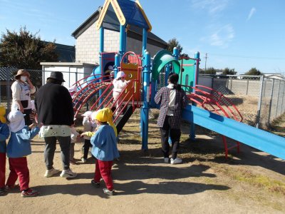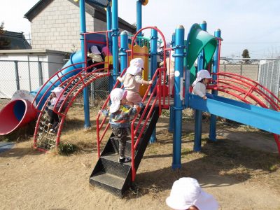 今日も昨日に引き続き園庭で遊びました。芝生の山が人気で、先生が遊んでいいよというと真っ先に芝生に向かう子どもが多かったです。他にもジャングルジムで遊んだり、すべり台で遊んだりする子どももいました。